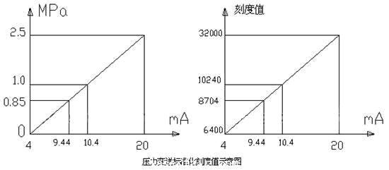在本套系統(tǒng)中,為了生產(chǎn)需求,鍋爐內(nèi)蒸汽壓力應維持在0.85-1.0MPa之間,壓力的大小由壓力變送器檢測,變送器壓力量程0-2.5MPa,輸出DC4-20mA。因此在0.85MPa時,相應的電流輸出是9.44Ma,同樣1.0MPa時輸出為10.4mA,其標準化刻度值如下圖所示。