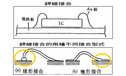 焊線接合首先將芯片固定在合適的基板或?qū)Ь€架(Lead Frame)上,再以細(xì)金屬線,將芯片上的電路與基板或?qū)Ь€架上的電路相連接如圖所示。
