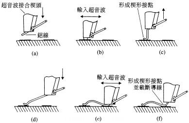 第二種壓焊方法是楔形制程,這種制程主要使用鋁線,但也可用金線,通常都在室溫下進(jìn)行。楔焊將兩個(gè)楔形焊點(diǎn)壓下形成連接,在這種制程中沒(méi)有球形成。鋁線焊接制程被歸為超聲波線焊,形成焊點(diǎn)只用到超聲波能、壓力以及時(shí)間等參數(shù)。