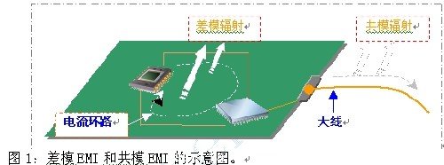 在PCB電路板中,電磁能的存在有兩種形式,即差模EMI和共模EMI。當器件輸出的電流流入一個負載時,就會產(chǎn)生差模EMI。當電流流經(jīng)多個導電平面,如PCB上的導線組或電纜,就會產(chǎn)生共模EMI。圖1給出了差模EMI和共模EMI的示意圖。