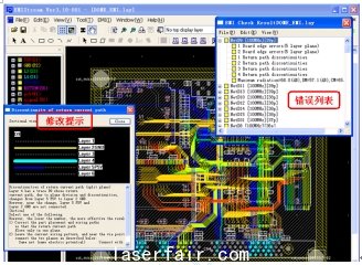 圖3:檢查結(jié)果以對話框的方式顯示出來,出錯網(wǎng)絡在PCB版圖上將高亮度顯示,所有錯誤用紅圈在網(wǎng)絡上標出。