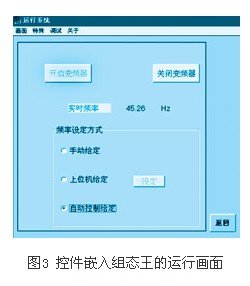 利用bcb中能生成activex控件的項(xiàng)目編寫(xiě)器new-》other-》activex-》activeform,編寫(xiě)相關(guān)程序?qū)崿F(xiàn)控制變頻器的功能,并通過(guò)bcb自帶的view工具欄中的typelibrary工具來(lái)編譯生成控件,此控件經(jīng)打包可生成在組態(tài)王中認(rèn)始的ocx控件,此控件同樣可設(shè)置是否具有可讀可寫(xiě)的屬性,此屬性是在typeliabrary工具中設(shè)置編譯后得到的,需要幾個(gè)參數(shù),其各是什么屬性,完全可以自由添加,非常簡(jiǎn)單方便。并可通過(guò)bcb相關(guān)程序,設(shè)置相關(guān)屬性對(duì)內(nèi)對(duì)外的具體連接功能。實(shí)際上,此過(guò)程實(shí)現(xiàn)的就是變頻器與bcb控件的通信,控件與組態(tài)王的通信,此方式彌補(bǔ)了組態(tài)王中不提供的相關(guān)變頻器等的驅(qū)動(dòng)程序,而無(wú)法利用組態(tài)王的缺陷,可通過(guò)bcb方便實(shí)現(xiàn)相關(guān)功能的驅(qū)動(dòng),而又間接實(shí)現(xiàn)了組態(tài)王控制變頻器等的驅(qū)動(dòng)。實(shí)際bcb與變頻器等的通信也非常簡(jiǎn)便,只要確定了通信協(xié)議,就可利用mscomm控件,方便的編寫(xiě)通信程序,實(shí)現(xiàn)變頻器等的控制。用bcb制作通用控件嵌入組態(tài)王從而實(shí)現(xiàn)組態(tài)王與變頻器的通訊,其運(yùn)行畫(huà)面如圖3所示。