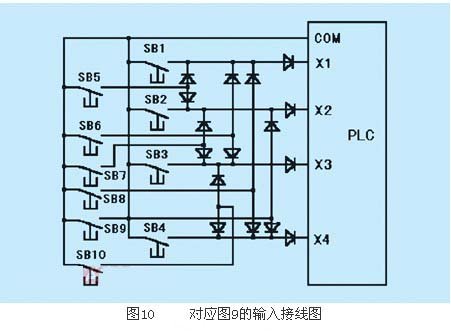 對應(yīng)圖9的輸入接線如圖10所示,圖10中的二極管用來切斷寄生信號。在調(diào)整時,若操作人員同時按下sb7和sb8(或sb6和sb9),則會發(fā)出報警信號。為了避免這種情況的發(fā)生,專門設(shè)置了一個判別程序,利用t12的常閉觸點禁止第5到第10邏輯行執(zhí)行,保證錯誤信號無法執(zhí)行。編程過程中可用t0到t11替代sb1到sb10信號。