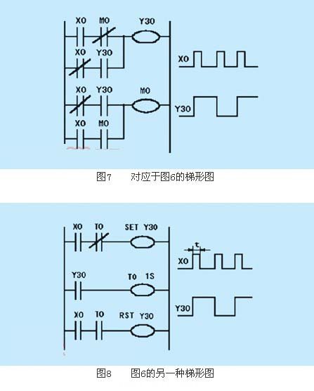 一般情況下,plc控制的外部設(shè)備至少要有1個起動按鈕和1個總停止按鈕作為輸入信號,來控制程序的運行和停止,因此至少需要2個輸入點。當輸入的總點數(shù)緊張時,也可用1個自復(fù)位按鈕sb3實現(xiàn)起動和停止兩種控制,其輸入接線如圖6所示,相應(yīng)的梯形圖可采用圖7或圖8所示的兩種設(shè)計方法。圖7中的m0為內(nèi)部繼電器,作中間環(huán)節(jié)使用。圖8中采用了置位、復(fù)位指令及定時器t0來完成單按鈕實現(xiàn)起動和停止的功能。采用圖8所示的梯形圖時,應(yīng)注意t0的設(shè)定值應(yīng)大于按鈕x0按住的時間t。