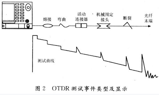 OTDR位置仍同“前向單程”監(jiān)測,但在接續(xù)方向的始端將兩根光纖分別短接,組成回路。這種方法即可滿足中繼段光纖測試,也可對光纖接續(xù)進行監(jiān)測。對中繼段光纖測試可以在光時域反射儀的顯示屏上很清楚地看到入射光脈沖、反射光脈沖、接頭點、斷裂點、故障點以及衰減分布曲線。OTDR測試事件類型及#p#分頁標題#e#顯示如圖2所示,它可以為光纜維護提供方便。