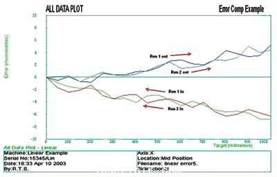 假如用戶計(jì)劃在軸線中間位置完成大部分的工作,則當(dāng)前補(bǔ)償可以為是最佳的解決方法,由于它將最大誤差分布在軸線端部,而最小的誤差則在中間位置。刪除誤差補(bǔ)償將產(chǎn)生燕尾狀圖形。