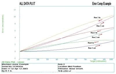 為保證測試的精確度,建議在開始校準(zhǔn)之前要讓機(jī)床完全預(yù)熱。在圖3中,安裝滾珠絲杠的端部可能正好與行程起始點(diǎn)重合,并且可在另一端產(chǎn)生軸向浮動。假如滾珠絲杠在對端受到限制,圖形將顯示負(fù)坡度。