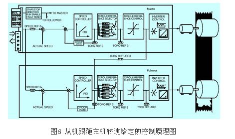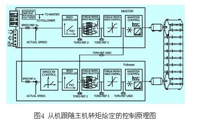 abbacs800系列變頻器主從控制采用直接轉(zhuǎn)矩(dtc)作為其核心控制原理。而直接轉(zhuǎn)矩控制技術(shù)是在變頻器內(nèi)部建立了一個(gè)交流異步電動(dòng)機(jī)的軟件數(shù)學(xué)模型,根據(jù)實(shí)測(cè)的直流母線電壓、開關(guān)狀態(tài)和電流計(jì)算出一組精確的電機(jī)轉(zhuǎn)矩和定子磁通實(shí)際值,并將這些參數(shù)值直接應(yīng)用于控制輸出單元的開關(guān)狀態(tài),變頻器的每一次開關(guān)狀態(tài)都是單獨(dú)確定的,這意味著可以產(chǎn)生實(shí)現(xiàn)最佳的開關(guān)組合并對(duì)負(fù)載變化作出快速地轉(zhuǎn)矩響應(yīng),并將轉(zhuǎn)矩相應(yīng)限制在一拍以內(nèi),且無(wú)超調(diào),真正實(shí)現(xiàn)了對(duì)電動(dòng)機(jī)轉(zhuǎn)矩和轉(zhuǎn)速的實(shí)時(shí)控制??刂圃砣鐖D3所示。