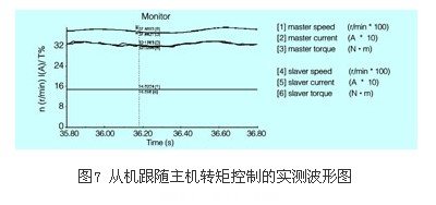 圖7為兩臺(tái)電機(jī)通過(guò)同一個(gè)減速機(jī)同軸聯(lián)結(jié)(剛性連接)的主從波形圖。采用abb傳動(dòng)調(diào)試軟件drivewindow監(jiān)測(cè)主機(jī)和從機(jī)在工作過(guò)程中的轉(zhuǎn)速([1]代表主機(jī),[4]代表從機(jī))、電流([2]代表主機(jī),[5]代表從機(jī))和輸出轉(zhuǎn)矩([3]代表主機(jī),[6]代表從機(jī))的波形。圖7中的數(shù)值為相應(yīng)的實(shí)測(cè)值。主機(jī)給定轉(zhuǎn)速為1480r/min。由圖可見,從機(jī)跟隨主機(jī)的轉(zhuǎn)矩輸出,兩電機(jī)分別輸出額定轉(zhuǎn)矩的約37.4%左右,負(fù)載分配基本平衡,兩電機(jī)實(shí)際輸出電流約為320a左右。由于主從機(jī)為剛性連接,主從機(jī)轉(zhuǎn)速由機(jī)械結(jié)構(gòu)保持同步,實(shí)際轉(zhuǎn)速為1480r/min左右。