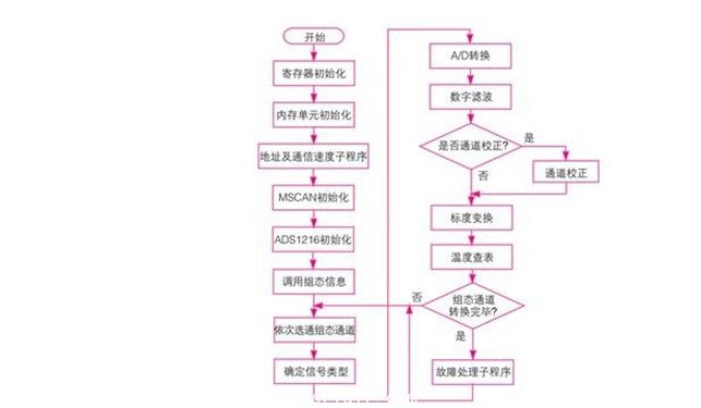 單片機程序用mc9s12匯編語言編寫。在主程序首先完成各寄存器和存儲單元的初始化,再通過調用讀取地址子程序,得到i/o板卡的地址和can通信波特率,再完成mscan模塊和ads1216初始化。隨后調用e2prom中組態(tài)信息,對每一路組態(tài)通道進行信號轉換,數(shù)字濾波及溫度查表計算等,其主程序流程圖如圖5所示。