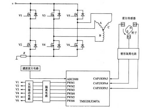 圖2 用TMS320LF2407A實現(xiàn)三相無刷直流電動機調(diào)速的控制和驅(qū)動