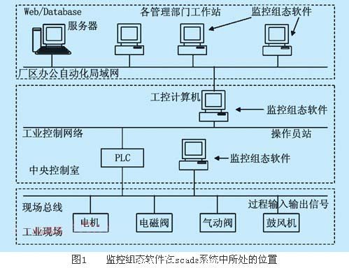 在一個自動監(jiān)控(supervisory control and data acquisitionscada)系統(tǒng)中,投入運行的監(jiān)控組態(tài)軟件是系統(tǒng)的數(shù)據(jù)采集和處理中心、遠程監(jiān)控中心和數(shù)據(jù)轉(zhuǎn)發(fā)中心。處于運行狀態(tài)的監(jiān)控組態(tài)軟件與各種控制、檢測設(shè)備如掛接在現(xiàn)場總線上的工控計算機、plc、智能儀表、智能設(shè)備等共同構(gòu)成快速響應(yīng)控制中心。控制方案和算法一般在設(shè)備上組態(tài)并執(zhí)行,也可在工控計算機上組態(tài),然后在下裝到設(shè)備中執(zhí)行,根據(jù)設(shè)備的具體要求而定[1]。組態(tài)軟件在scada系統(tǒng)中所處的位置如圖1所示。