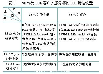 在利用vb開發(fā)dde客戶/服務器應用程序中,欲建立dde鏈接,完全依賴對象的dde屬性設置。vb分別作為dde客戶和dde服務器時,dde屬性的不同設置(見表3)。