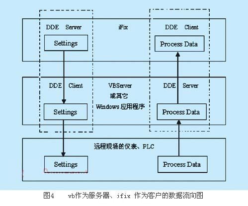通常情況下,現場的檢測信號和運動參數的流向是從ifix傳輸到vb開發(fā)的應用程序vbsrvapp或其它的windows應用程序,再由windows應用程序或vbsrvapp以命令形式經ifix下達給遠程現場的智能儀表或plc等遠程的現場設備,如油漆烘間和膠爐各自的設定溫度、純水進口的設定壓力、顏料的設定濃度等參數。