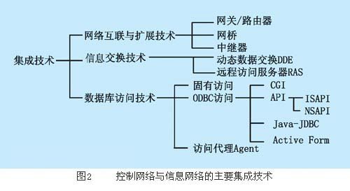 為方便討論問題、現舉例說明。根據某生產自動化改造工程要求,需要對系統(tǒng)進行組態(tài)監(jiān)控操作平臺設計,采用組態(tài)軟件ifix2.2和windows應用軟件vb6.0,開發(fā)并實現基于dde機制的進程間數據交換,滿足工業(yè)控制網scada工控計算機內部信息交換需要,為各應用程序通過共享內存交換信息,實現控制網絡與信息網絡的集成,并為進一步進行windows程序間的數據交換開發(fā)提供有借鑒意義的參考[3]。控制網絡與信息網絡的主要集成技術如圖2所示。