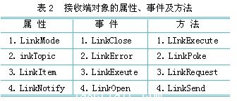 vb中支持dde的對象有5類:窗體(form)、多文檔窗體(mdiform)、標簽(label)、文本框(textbox)和圖片框(picturebox)。其中,窗體和多文檔窗體可作為dde服務器即數據的提供者,label、textbox和picturebox等可以作為dde服務器即數據的接收者。vb為支持dde給發(fā)送端對象提供了2種dde屬性和4種dde事件,給接收端對象提供了4種dde屬性、4種dde事件和4種dde方法(見表2)。#p#分頁標題#e#