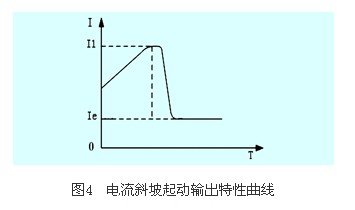 圖4為電流斜坡起動模式的輸出電流波形,其中i1為限流值,t1為設置的時間值。電流斜坡起動模式具有較強的加速能力,適用于兩極電動機,也可在一定范圍內(nèi)縮短起動時間。