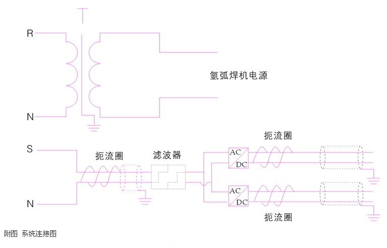 在本案例中,氬弧焊機(jī)電源與伺服驅(qū)動(dòng)器供電電源分別供給。氬弧焊機(jī)電源用隔離變壓器隔離,伺服電源線外套一個(gè)扼流圈后送入有源功率濾波器,經(jīng)過濾波后,再送至開關(guān)電源。伺服驅(qū)動(dòng)器的動(dòng)力電源和控制電源用2個(gè)開關(guān)電源分別供電,且在接入驅(qū)動(dòng)器前分別套一個(gè)扼流圈。驅(qū)動(dòng)器電源與控制(編碼器)電源均連接了屏蔽線,并確保單端可靠接地。如附圖為系統(tǒng)接線圖。