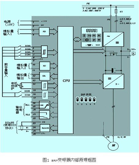 mmv變頻器是一種無速度傳感器矢量控制的通用型變頻器,可以廣泛地用于各種三相交流電機的轉(zhuǎn)速控制。mmv變頻器啟動轉(zhuǎn)矩大,控制精度高,過載能力強,保護措施安全可靠。安裝、設(shè)定、調(diào)試都比較方便。通過計算所需的輸出電流和頻率的變化量以維持所期望的電機轉(zhuǎn)速、轉(zhuǎn)矩等,使其不受負載條件變化的影響??梢酝ㄟ^串口(rs-485和rs-232)實現(xiàn)遠程控制,使用uss通訊方式可控制多達31臺變頻器。mmv變頻器可以方便地通過mpi和s7-200/300plc相連接,其內(nèi)部結(jié)構(gòu)框圖如圖1所示。