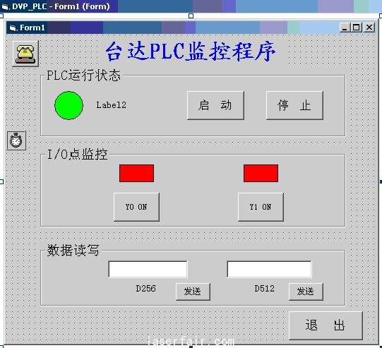 用按鈕控制PLC的起動停止,Y0、Y1的ON/OFF及D256、D512寫完數(shù)據(jù)的發(fā)送;用Shape組件做指示燈,表示PLC的運行狀態(tài)和Y的狀態(tài);用timer組件不停的讀取M1072的狀態(tài),以判斷PLC的運行情況;用MScomm控件實現(xiàn)PC與PLC的通信。