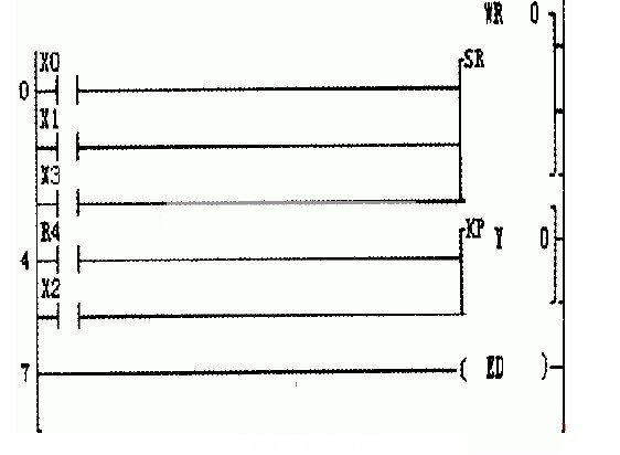 圖7所示程序中,WR0即為字元件,是左移位指令SR的編程元件,而Y0為輸出軟繼電器的線圈,X0、X1、X2、X3則為輸人軟繼電器的觸點(diǎn),其中第4步的R4觸點(diǎn)為位元件R4的常開(kāi)觸點(diǎn),而位元件R4又是字元件WR0中的一位,因此其狀態(tài)受限于WR0的移位結(jié)果。