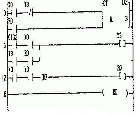 程序1調(diào)試結(jié)果:X0接通3次,Y3接通,X0再接通1次,Y3斷開(kāi)。