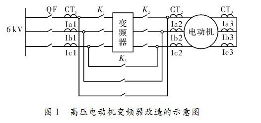 發(fā)電廠為保證系統(tǒng)的可靠性,高壓電動(dòng)機(jī)一般采用變頻器帶工頻旁路,以便即使在變頻器檢修時(shí)也可通過(guò)工頻旁路,保證電動(dòng)機(jī)的正常運(yùn)行。圖1為現(xiàn)場(chǎng)高壓電動(dòng)機(jī)變頻器改造的示意圖,其中K1、K2開(kāi)關(guān)保證變頻器檢修時(shí),與主回路無(wú)接觸點(diǎn),此時(shí)K3開(kāi)關(guān)閉合,電動(dòng)機(jī)通過(guò)旁路運(yùn)行。