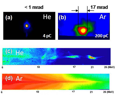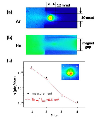 圖1.實(shí)驗(yàn)從團(tuán)簇(a)和氣體(b)獲得的Betatron輻射及能譜(c)