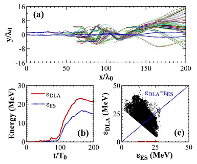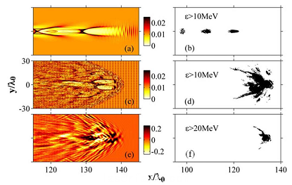 圖4.模擬顯示團(tuán)簇使DLA機(jī)制得以激發(fā),電子從橫向獲得能量和很大波蕩幅度,利于betatron輻射產(chǎn)額的提升