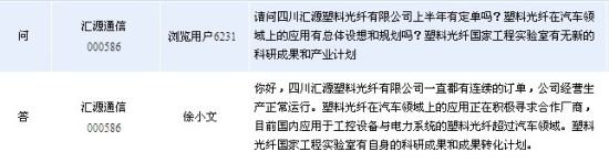 匯源通信 (5.57,0.05,0.91%) ( 000586 )周三在全景網(wǎng)互動(dòng)平臺(tái)上表示,公司子公司四川匯源塑料光纖有限公司一直都有連續(xù)的訂單,公司經(jīng)營(yíng)生產(chǎn)正常運(yùn)行。 近日,有投資...