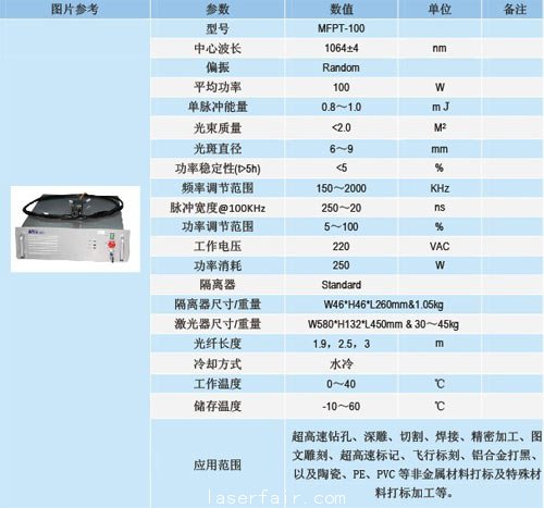 MFPT-100 脈寬可調(diào)MOPA脈沖光纖激光器的工作波長穩(wěn)定在1064+4nm,功率可調(diào)范圍5%-100%,脈沖寬度可調(diào)范圍20ns-250ns,脈沖重復(fù)頻率150-2000KHz,通過定制可實現(xiàn)高達1mJ的峰值功率輸出,滿足了工業(yè)應(yīng)用的諸多需求,是高重復(fù)頻率、即插即用的高新產(chǎn)品。