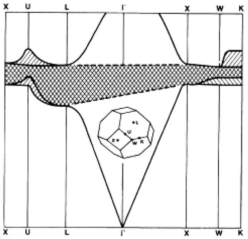 Yablonovitch及Gmitter在實驗中采用的周期性介電系統(tǒng)是在三氧化二鋁(Al2O3 )塊材中,按照面心立方(face-centered cubic, fcc)的排列方式鉆了八千個球狀空洞,這些空洞即所謂的“原子”,如此形成一個人造的巨觀晶體。三氧化二鋁和空氣的介電常數(shù)分別為12.5和1.0,面心立方體的晶格常數(shù)是1.27公分。根據(jù)實驗量得的透射頻譜,所對應(yīng)的三維能帶結(jié)構(gòu)如圖4所示,其中左斜與右斜線分別代表兩種不同的偏極化模。由此圖所求得的絕對能(absolute gap)位于15GHz的微波范圍,寬度約有1GHz。