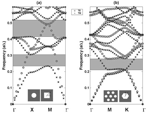 圖9. (a)正方晶格光子晶體的能帶結(jié)構(gòu);(b)三角晶格光子晶體的能帶結(jié)構(gòu)
