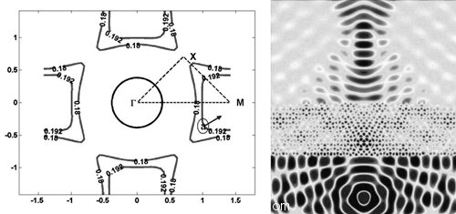 若我們將光子晶體的能帶結(jié)構(gòu)展開,則可得到許多頻率等高線(frequency contours)。如圖12所示,為正方晶格轉(zhuǎn)45度后的頻率等高面。由空氣中入射的電磁波會沿垂直于等頻率線且頻率增加的方向傳播,如此就可產(chǎn)生超棱鏡現(xiàn)象(superprism phenomena)或是負折射(negative refraction)現(xiàn)象。此外利用負折射現(xiàn)象有機會達到次波長成像(subwavelength imaging)圖12右圖所示。