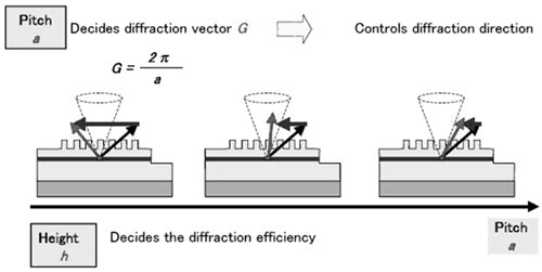 在光子晶體的設(shè)計上有一些重點,有一個指針是周期。周期和衍射的距離有關(guān),如果周期越小,衍射的距離就越大,縱使經(jīng)過修正后還是沒有辦法將光發(fā)射到外面去。相對的如果周期變大,衍射的距離越小,因為這樣的關(guān)系,光就可以移到外面去了,所以在設(shè)計上需要找到一個最適合的周期。