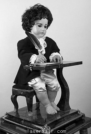 名叫“作家”的“寫字機(jī)器人”已有240年的歷史,它是由瑞士鐘表匠皮埃爾·雅奎特-德羅茲和他的兩個兒子亨利-路易斯、讓-弗里德里克·萊斯肖特在18世紀(jì)70年代制造出來的。“寫字機(jī)器人”的外表看起來像個3歲的男孩玩偶,不可思議的是,當(dāng)“寫字機(jī)器人”背后的發(fā)條被上緊后,它就會抬起右臂,將手中的鵝毛筆伸到桌子右側(cè)的墨水壺中蘸一下,然后在桌子當(dāng)中的白紙上緩緩寫出幾行詞句。據(jù)悉,“寫字機(jī)器人”寫出的詞句最多可以包含40多個字母。