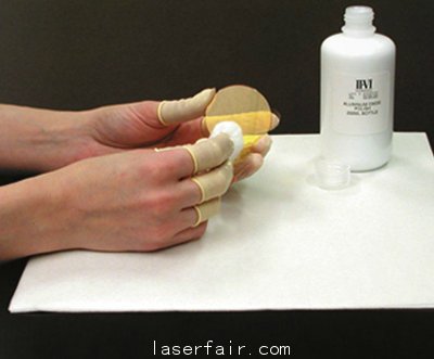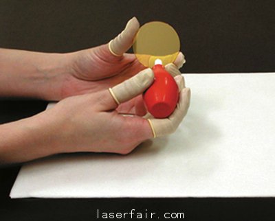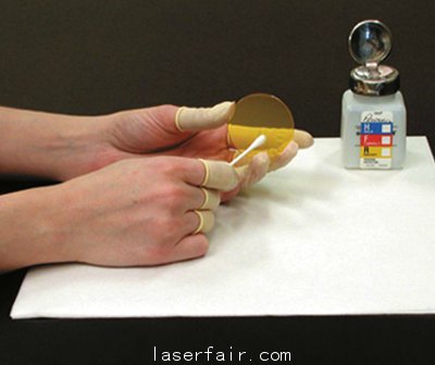 第二步應(yīng)用丙酮對鏡片作輕微清洗。這種級別的丙酮幾乎是無水的,這就降低了鏡片污染的可能性。 棉花球蘸上丙酮必須在光照下清洗鏡片,并做環(huán)狀移動。棉簽一旦臟了,須更換。清洗要一次完成以避免產(chǎn)生波筋。 (如果鏡片有兩個鍍膜表面,如透鏡,每個面都需要以這種方法清洗。第一面需要放在一層干凈的透鏡紙上以起保護(hù)作用。)