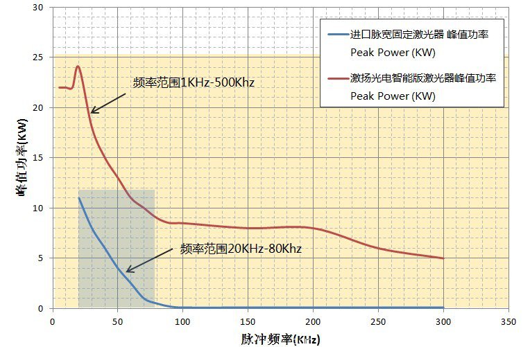 圖2.  智能版激光器的頻率范圍由脈寬固定激光器的20KHz-80KHz范圍(圖中淺藍色部分)拓展到1KHz-500KHz(圖中淺橙色部分),而且峰值功率保持在較高的水平