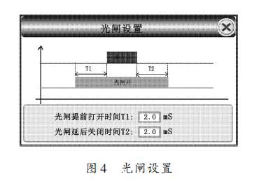 在圖3觸摸屏界面中,點(diǎn)擊“光閘設(shè)置”可以進(jìn)入光閘控制的設(shè)置界面,如圖4所示,智能光閘控制,ms級(jí)時(shí)間內(nèi)的延遲時(shí)間可根據(jù)需求定制,保證完全遮光,功能穩(wěn)定,而且操作界面顯示和設(shè)置都非常友好方便。