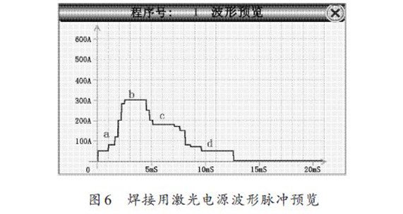 針對(duì)以上問題,設(shè)計(jì)的這款激光電源控制器,可以控制每個(gè)打出的激光脈沖的功率,并對(duì)單個(gè)激光脈沖,進(jìn)行精確分段,每段設(shè)置,保證焊點(diǎn)光滑平整。圖6是針對(duì)某種焊接工件給的激光波形預(yù)覽。