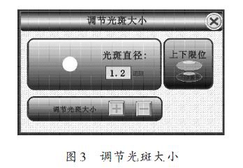 圖3 顯示的是系統(tǒng)搭建完成后液晶控制觸摸屏上顯示調(diào)節(jié)光斑直徑的界面。在該界面上通過增、減調(diào)節(jié),在上、下限范圍內(nèi)設(shè)置光斑直徑的實(shí)際值。內(nèi)部是通過控制步進(jìn)電機(jī)調(diào)整透鏡位置,調(diào)整激光焦距,從而使光斑直徑發(fā)生改變。