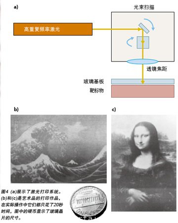 脈沖激光沉積的一種特殊變體是激光誘導反向轉(zhuǎn)移(LIBT)技術,可以應用于高分辨率的激光直寫。這項技術是用激光光束穿過透明的基質(zhì)來燒蝕附近的靶標物。激光誘導蒸汽被反向推動到透明的基質(zhì)上進行沉淀。LIBT技術在激光領域有著廣泛的應用。將超快光纖激光器用于這項技術,我們可以進行廣泛、連續(xù)的灰度范圍內(nèi)的圖像打印,這只能在MHz級別的高重復頻率下實現(xiàn)。圖4(a)展示了這一體系。計算機控制的光束掃描儀根據(jù)原始圖像的灰度級別來改變光束掃描速度。高重復頻率會產(chǎn)生多脈沖的空間重疊,相應的沉積量也會累積,從而渲染出連續(xù)灰度的視覺效果。