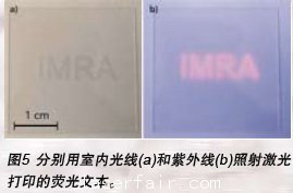 這種技術可以擴展打印材料的附加功能。圖5 是一個打印熒光文字的例子,靶標物由磷粉組成。圖5(a)顯示了打印的文字在房間內(nèi)的燈光下呈半透明。圖5(b)顯示了用紫外線照射同樣的文字, 靶標物的磷粉發(fā)出明亮的橙色熒光。這個示例說明超短脈沖激光燒蝕不是一個破壞性的過程, 并沒有破壞材料, 通過激光燒蝕可以保留靶標物的某些功能特性。