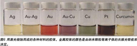 在液體中進行激光燒蝕的一個特殊優(yōu)勢是,納米顆粒表面在燒蝕期間是帶電的,而膠體在靜電中是穩(wěn)定的,無需穩(wěn)定劑,例如在化學合成方法中廣泛使用的檸檬酸。這是特別有利的,因為在對納米顆粒的表面進行生物功能基化時,金的表面更容易與其他試劑發(fā)生反應。圖6顯示了各種材料的膠體,包括貴金屬、金屬合金和有機物,所有這些都是用超快脈沖激光在液體中進行燒蝕而制成的。