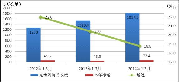 2012-2014年一季度光纜線路總長度發(fā)展情況
