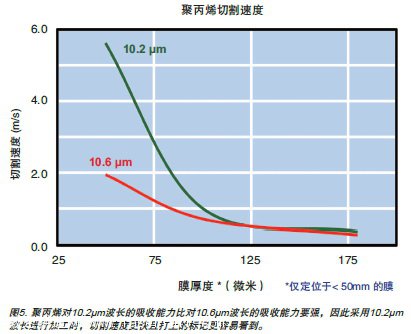 大部分用于包裝應(yīng)用的聚合物膜的紅外吸收光譜包括很多個(gè)峰值。因此, 激光器波長中的微小偏移會(huì)對吸收效率造成巨大的影響。而且,由于包裝涉及的膜非常薄,通常只吸收小部分的入射激光功率,因此吸收效率的小幅上升就可能會(huì)大大提高加工速度和效率。因此,雖然采用傳統(tǒng)10.6μm波長的CO2激光器最常用于包裝應(yīng)用,但是經(jīng)證實(shí)用于某些塑料材料(尤其是聚丙烯和雙向拉伸聚丙烯 (BOPP)時(shí),輸出為10.2μm 的CO2激光器的加工速度更快且效果更勝一籌。同樣,用于聚酰亞胺(PI)、硅膠、三氯化聚乙烯(PET)、聚丙烯(PP)和聚苯乙烯(PS)時(shí),輸出為9.3μm的CO2激光器表現(xiàn)出更快的加工速度和更勝一籌的效果。Coherent生產(chǎn)了可選擇10.6μm、10.2μm或9.3μm輸出的J系列CO2激光器, 專門用于滿足這些應(yīng)用的需求。