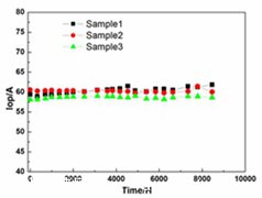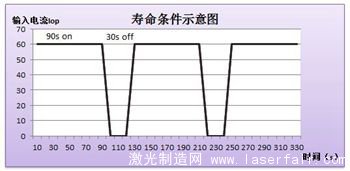 采用全金錫焊料封裝HCS02系列產(chǎn)品非常適用于工業(yè)和科研領(lǐng)域,尤其是在硬脈沖(hard pulse-on and off operation)工作條件下的應(yīng)用。如圖2和圖3所示,西安炬光科技有限公司研發(fā)的FL-HCS02-50-825產(chǎn)品在25度,恒流60A下以90s開(kāi)、30s關(guān)的條件進(jìn)行壽命測(cè)試,結(jié)果顯示壽命測(cè)試時(shí)間已經(jīng)突破了8000h。這種hard pulse on and off模式非??简?yàn)產(chǎn)品的抗熱疲勞效應(yīng),如果是采用銦焊料(或者其他soft solder)進(jìn)行焊接,極容易被這種hard pulse 條件破壞焊料層,形成銦焊料的失效,進(jìn)而導(dǎo)致產(chǎn)品失效。而采用全金錫焊料封裝的FL-HCS02-50-825完全可以從根本上解決這一問(wèn)題。