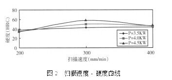 從測量的硬度變化可以看出。在速度較低時,當(dāng)掃描速度一定時,隨著激光功率的增加,表面硬度有所下降。但是當(dāng)掃描速度加快時,隨著激光功率的增加,熔覆層表面硬度又越來越高。當(dāng)功率一定時,掃描速度越快,硬度越高。到一定的速度又有所下降,硬度變化規(guī)律用曲線表示如圖2 :
