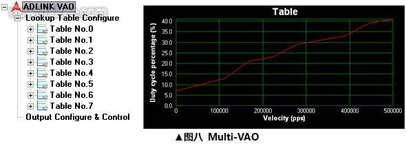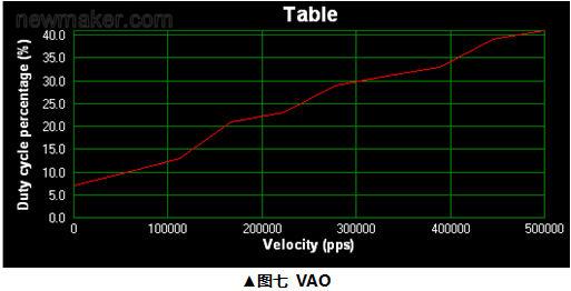 傳統(tǒng)運動控制卡的PWM控制,均采用Duty單一控制方式,且通過軟件控制,會面臨無法實時且穩(wěn)定控制PWM的時序。為了應(yīng)對不同速度與不同圖形,新一代運動控制卡采用更多種控制方式,包含頻率調(diào)變(Frequency Modulation)、帶寬調(diào)變(duty Modulation)、混合調(diào)變(Blend Modulation),如圖六所示,此控制方式會由硬件控制來完成,此PWM能在各種切割速度下呈現(xiàn)出不同能量的表現(xiàn),因此需建立一對應(yīng)的能量表,以防止發(fā)生『過融現(xiàn)象』,此能量控制就稱(VAO),如圖七所示。