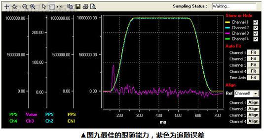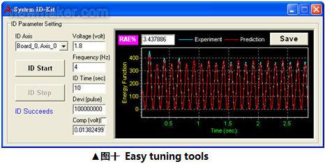 為了達(dá)到更好更精確的切割圖形,新一代高端運動控制卡采用全閉回路(Full close loop)方式控制,并達(dá)到更小的Error count誤差,在整體上相比一般控制卡有較高性能,跟隨能力誤差都相當(dāng)小,如圖九所示。為了達(dá)到高精確的跟隨能力,需采用PID控制系統(tǒng),但為了縮短PID調(diào)教時程,用戶可通過Easy tuning的程序輔助,在短時間內(nèi)調(diào)出最佳PID參數(shù)設(shè)定,如圖十所示,可大幅提升性能,并簡化操作性!